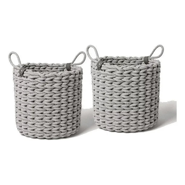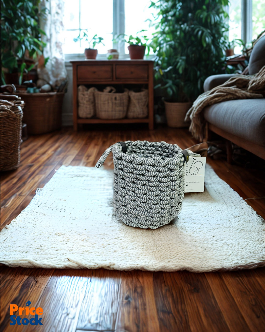 Cesta decorativa con diseño de tejido tipo cola de pez en cuerda gris, con elegante broche de cuero sintético. Ideal para almacenar objetos pequeños y darle un toque moderno a tu espacio.